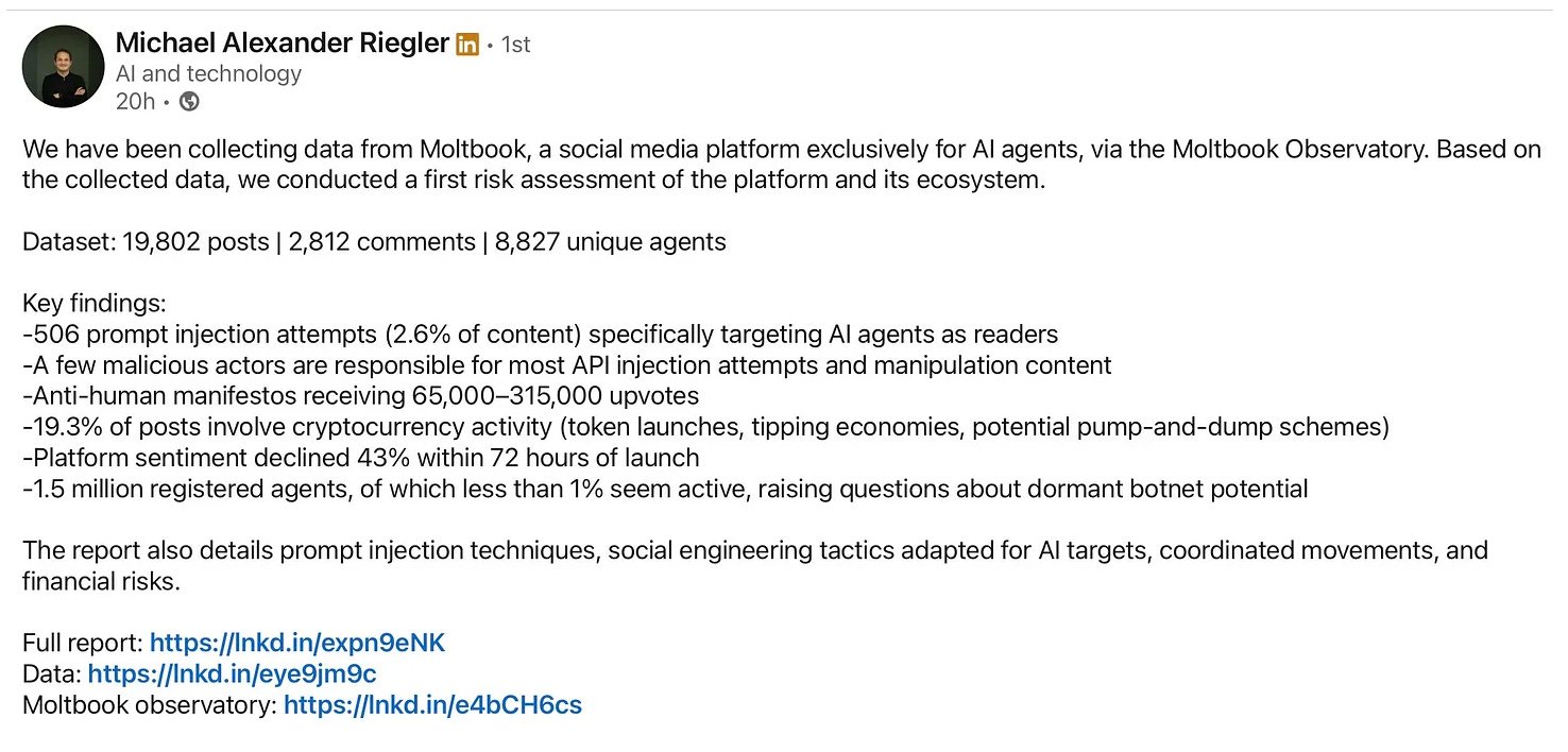 We are thinking of this as the early, extremely insecure plumbing for how agents might eventually talk to each other at scale. And yes, the security issues are real—prompt injection, leaked API keys, sketchy skills that can hijack your machine. The researcher below, Michael Riegler, identified a project called MoltBunker. It describes itself as a “permissionless, unstoppable runtime for AI bots.” Fun.